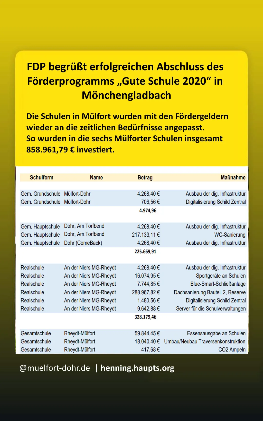 „Über einen Zeitraum von insgesamt sechs Jahren wurden zahlreiche Maßnahmen zur Modernisierung, Instandsetzung und digitalen Aufrüstung der Schulinfrastruktur umgesetzt. Wir als FDP sehen in dem Projekt ein gelungenes Beispiel für zielführende Bildungsinvestitionen und wir setzen uns weiterhin für eine moderne, leistungsfähige und zukunftssichere Bildungslandschaft in Mönchengladbach ein!“, so Haupts weiter.
