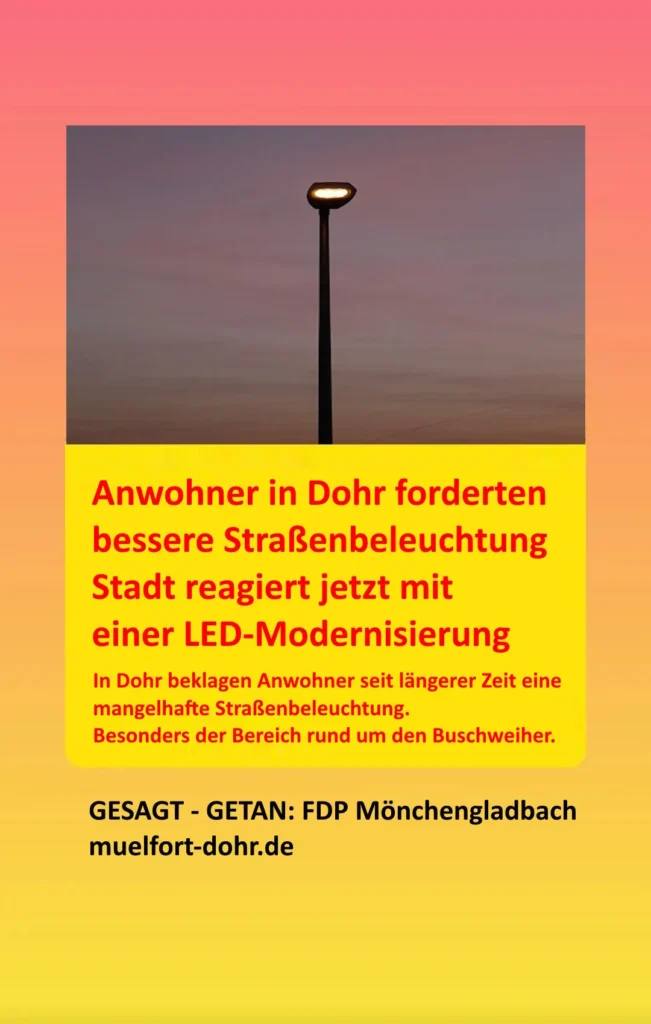 Mit dem Austausch der Leuchten will die Stadt nicht nur auf die berechtigten Einwände der Bürgerinnen und Bürger reagieren, sondern auch einen Beitrag zur nachhaltigen Stadtentwicklung leisten. Die Hohnschaft Dohr sowie weitere betroffene Ortsteile können sich somit ab Herbst 2025 auf spürbare Verbesserungen einstellen.