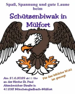 Am Samstag, den 21.06.2025, heißt es wieder „Gut Schuss!“ in Mülfort! Die Schützenbruderschaft St. Paul Mülfort veranstaltet ihren traditionellen Schützen-Biwak – ein Fest für die ganze Nachbarschaft!