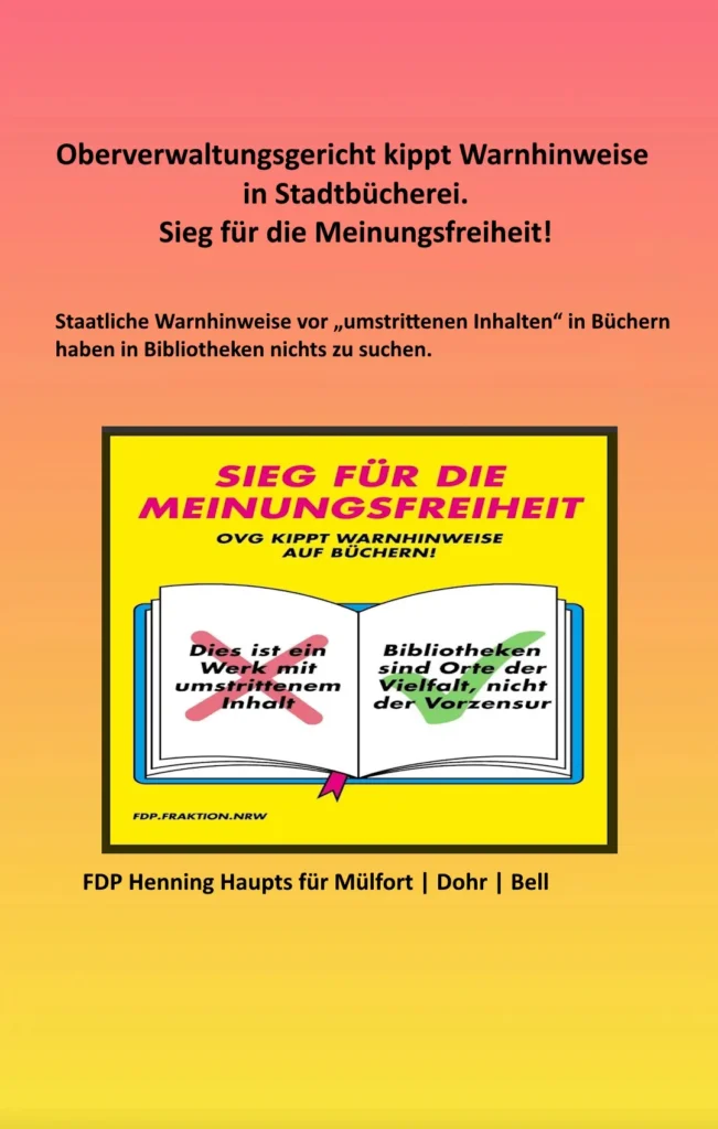 Wir Freie Demokraten begrüßen das Urteil als starkes Signal für Meinungsfreiheit und gegen staatliche Bevormundung. ⚖️ Warnhinweise wie in Münster gefährden den freien Diskurs und widersprechen der Neutralitätspflicht öffentlicher Einrichtungen.