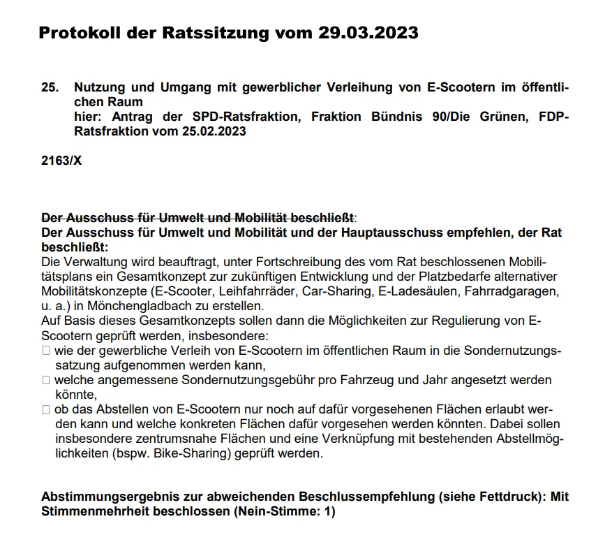 In dem Fraktions-Antrag fordern SPD, FDP und Bündnis 90/Die Grünen die Stadt auf, ein Gesamtkonzept zu erstellen, wie die zukünftige Mobilität in Mönchengladbach geregelt sein soll. Darunter fallen unter anderem auch E-Scooter, Leihfahrräder und Car-Sharing-Angebote.